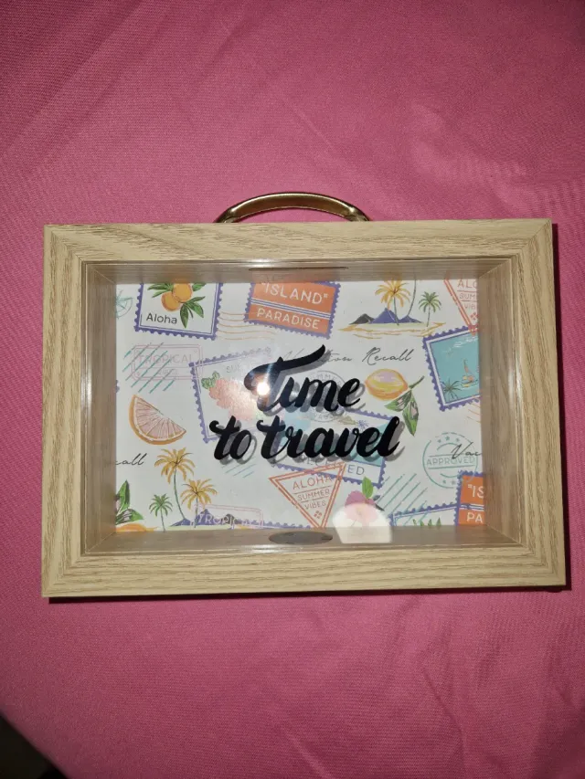 Salvadanaio decorativo in legno con scritta Time to travel, a tema viaggio.