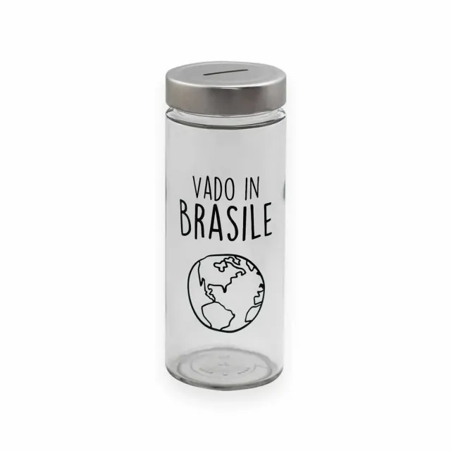 Salvadanaio in vetro trasparente con tappo in metallo argentato. - Scritta Vado in Brasile con disegno del mappamondo. - Ideale per risparmiare per un viaggio.