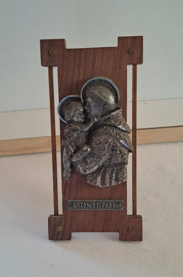 Souvenir di San Antonio di Padova, realizzato in legno e metallo. Asticelle laterali un pò rovinate. Altezza 14,5 cm Larghezza 7 cm