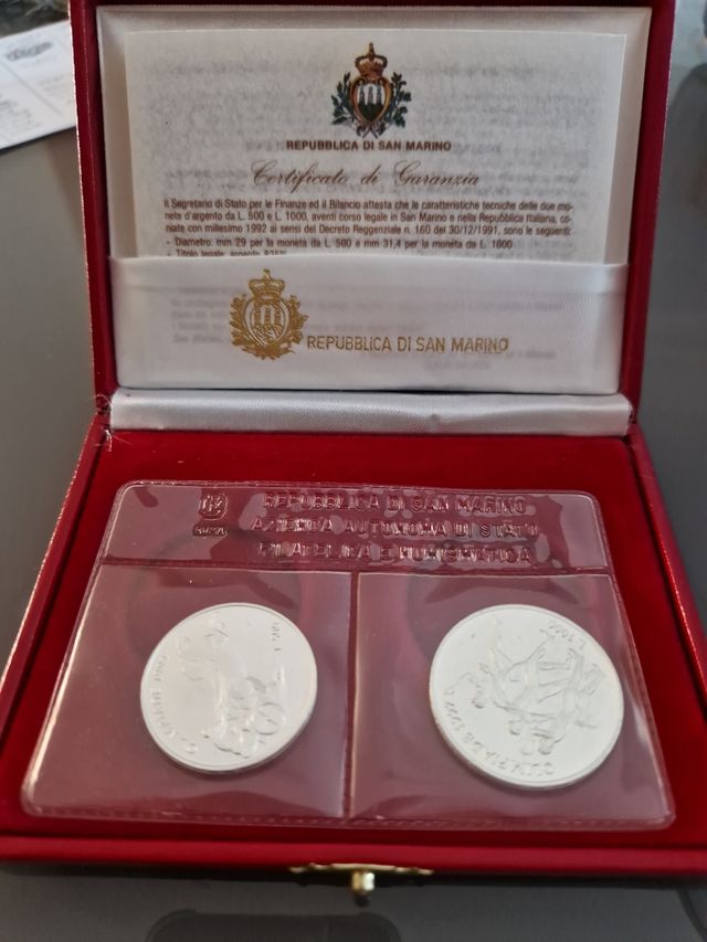 Vendo monete dittico di San Marino argento 835. L. 500 11 gr. E L.1000 14.6 gr. Del 1992 celebrative della XXV olimpiade. Vendo innastuccio originale
