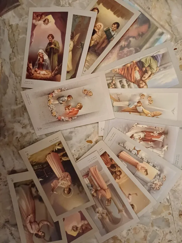 Dettagli del prodottoLotto di Santini religiosi vintage, risalenti agli anni '50 e '60. Raffigurano scene sacre e figure angeliche.