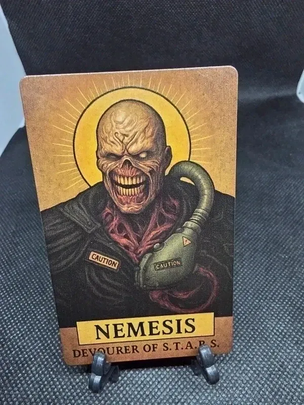 Opera artistica raffigurante Nemesis da Resident Evil 3. - Illustrazione dettagliata del personaggio. - Cornice in stile antico.