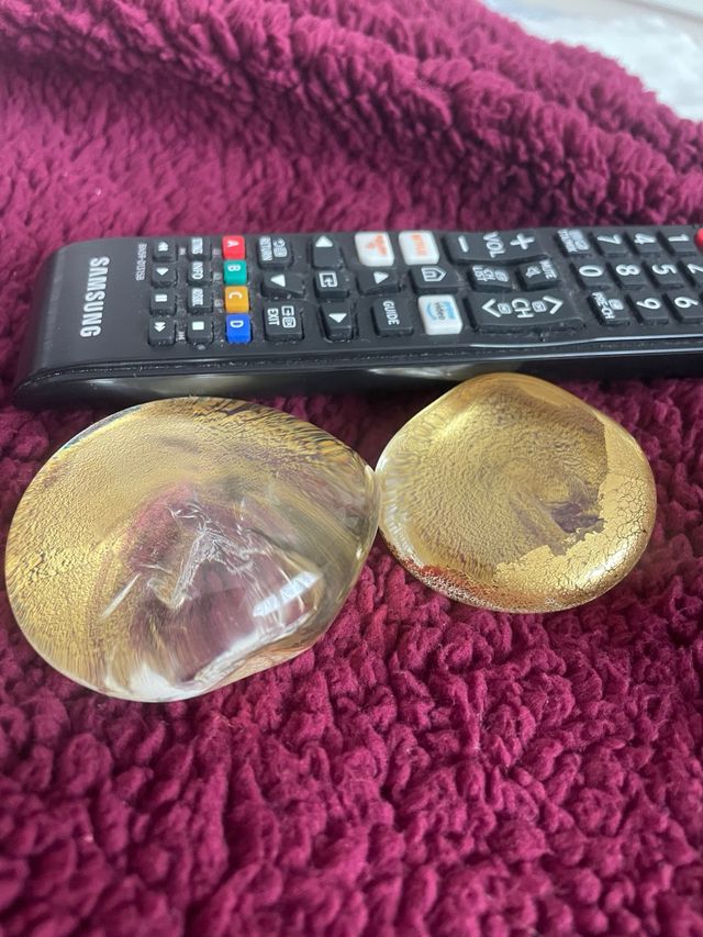 Due bellissimi sassi in vetro di Murano con foglia oro. - Realizzati in vetro colore cristallo trasparente e dorato. - Inserzioni di foglia oro.