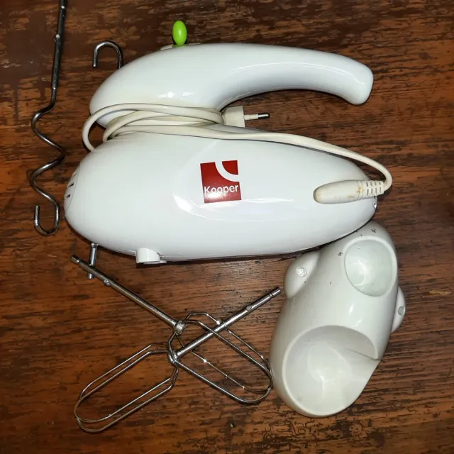 Dettagli del prodottoSbattitore elettrico bianco della marca Kooper,completo di supporto.