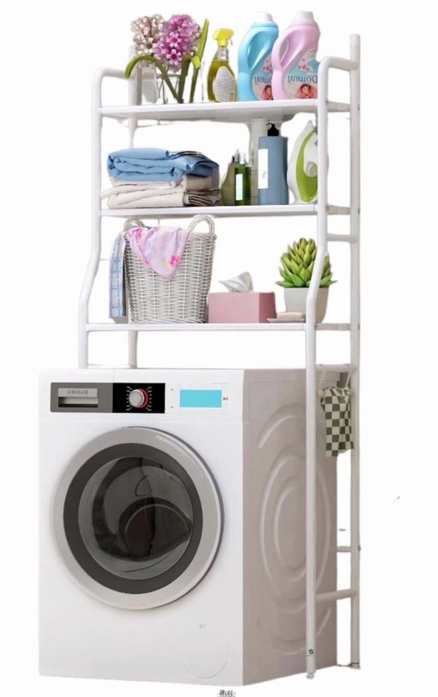 Pratico scaffale bianco da posizionare sopra la lavatrice, ideale per organizzare lo spazio in lavanderia.