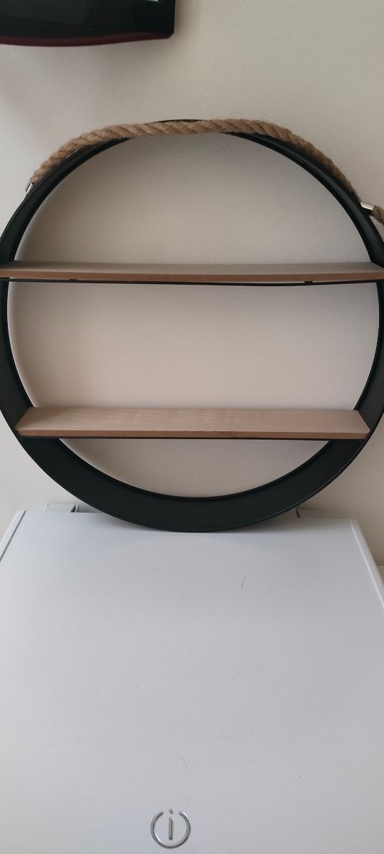 Scaffale rotondo con 2 ripiani in legno e metallo. Possibilità di appenderlo con la corda o con deo gancetti. 54 cm di diametro e 10 di profondità Trieste