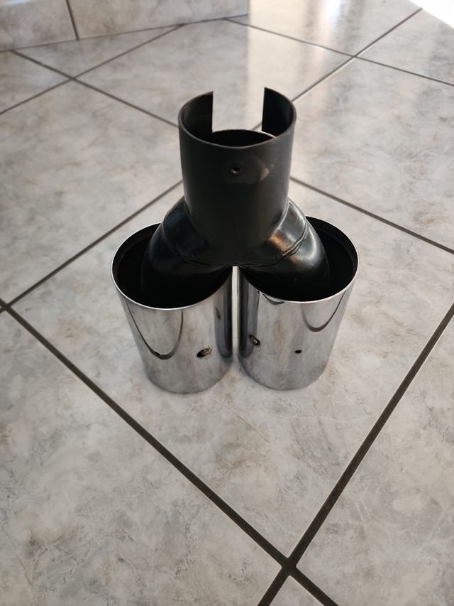 Dettagli del prodottoBuongiorno, vendo terminale di scarico doppio creato artigianalmente. Perfetto, solo da montare adattandolo al vostro tubo di scarico gas vettura La larghezza totale è di 16cm per un diametro dello scarico di 8cm (esterno). Foro di attacco a scarico originale :diametro 55mm Misure del prodotto