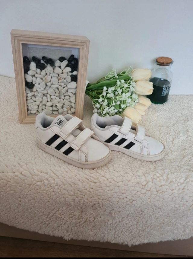 Scarpe da ginnastica Adidas per bambini, modello con chiusura a velcro. - Colore bianco con strisce nere. - Design comodo e pratico.