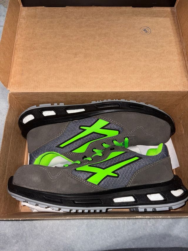 Scarpe antinfortunistiche U-Power. - Taglia 45. - Design grigio con dettagli verde fluo. - Suola nera con inserti bianchi.