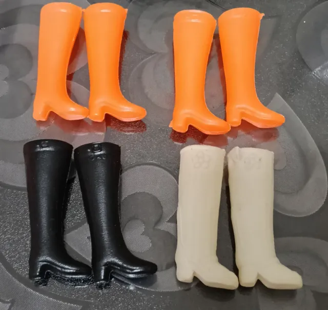 Set di scarpe vintage per Barbie, perfette per completare i look delle tue bambole. - 2 paia di stivali arancioni. - 2 paia di stivali neri. - 2 paia di stivali bianchi.