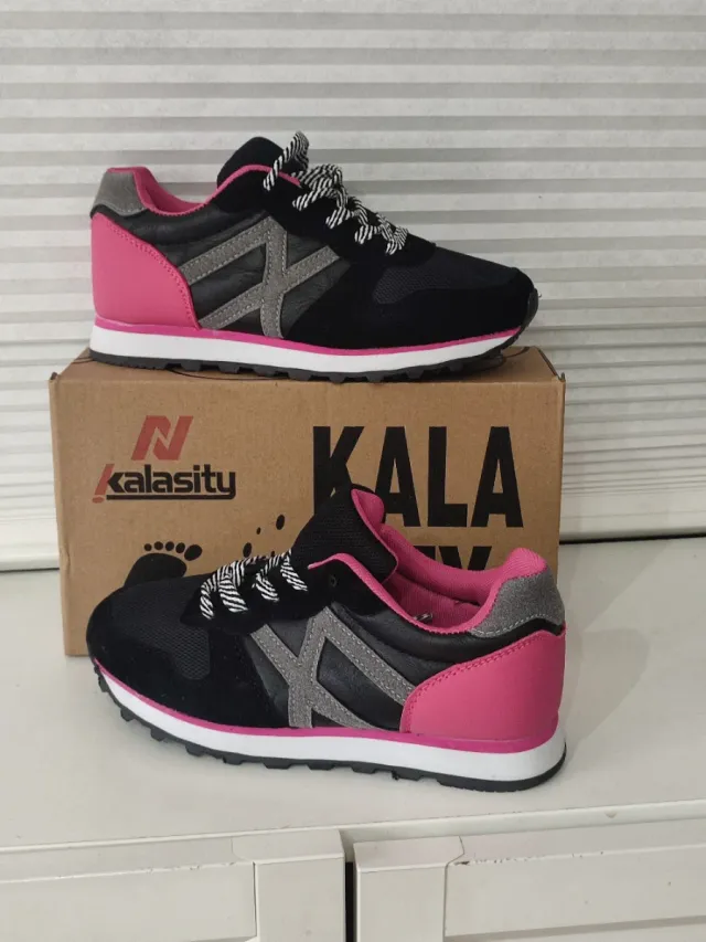 Scarpe da ginnastica per bambina marca Kalasity, numero 34. - Colore nero con dettagli rosa e grigi. - Chiusura con lacci.