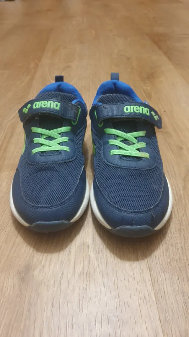 Scarpe da ginnastica Arena per bambino/a, taglia 38. - Colore blu con dettagli verdi. - Chiusura con velcro e lacci. - Logo Arena sul lato.