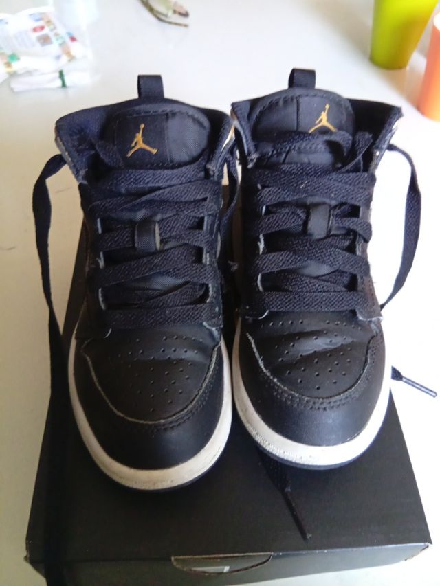 Scarpe Jordan per bambino, taglia 27. Modello high-top. - Colore nero con dettagli dorati. - Chiusura con lacci.