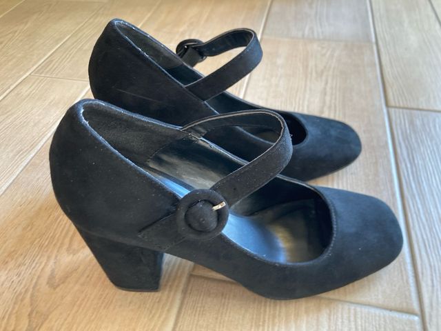 Scarpe modello Mary Jane nere, scamosciate con tacco largo e cinturino con fibbia.