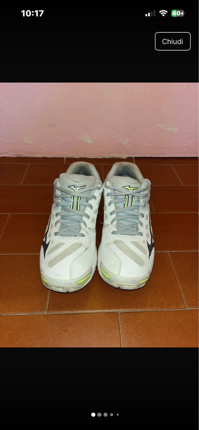 Scarpe da pallavolo Mizuno bianche. - Design sportivo. - Tomaia in materiale sintetico e mesh. - Suola in gomma antiscivolo.