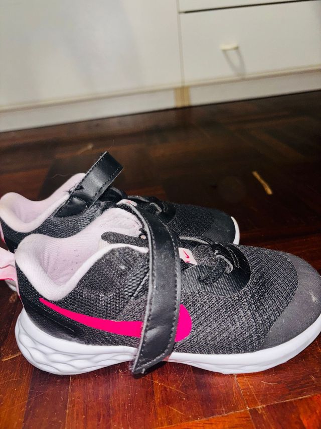 Scarpe da ginnastica Nike per bambina, numero 27. Colore nero con dettagli fucsia e suola bianca. - Chiusura con velcro. - Logo Nike sul lato.