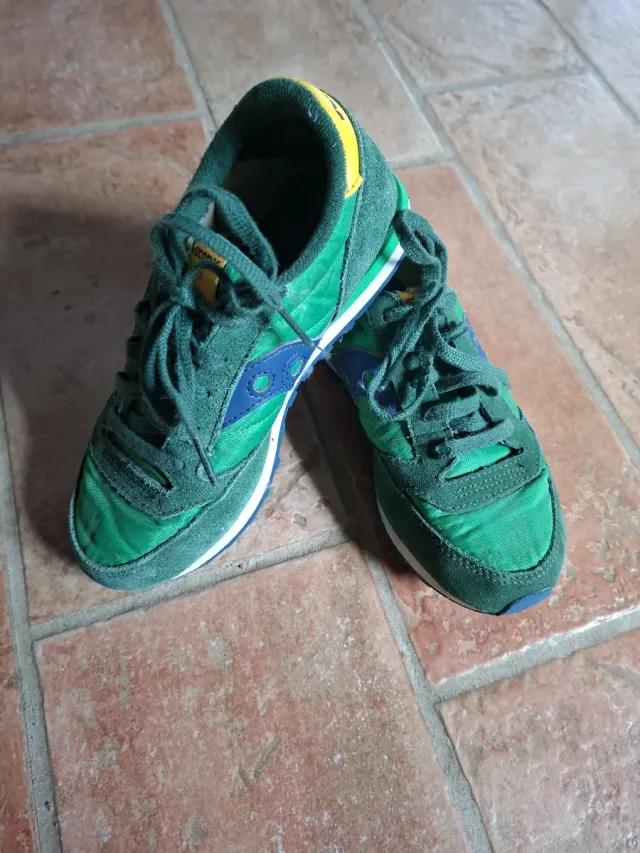 Scarpe da ginnastica Saucony per bambino. Tg. 32 - Colore verde con dettagli blu e gialli. - Materiale scamosciato e tessuto. - Chiusura con lacci.
