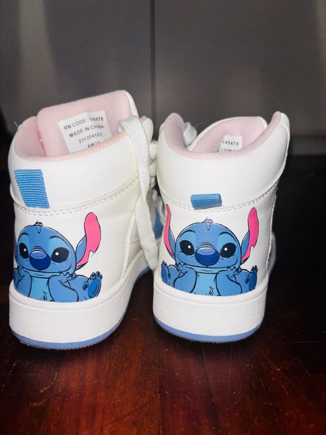 Scarpe da ginnastica alte per bambina con Stitch. - Taglia 27. - Design bianco con stampa Stitch. - Dettagli azzurri e rosa.