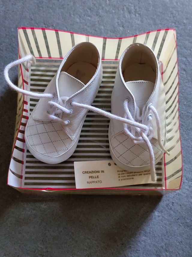 Dettagli del prodottoBellissime scarpine Baby Chick, in pregiata pelle nappa bianca, perfette per un bimbo/a. Sono nuove, mai usate, e ancora nella loro scatola originale.