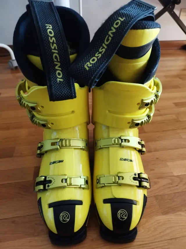 Dettagli del prodottoScarponi da sci Rossignol da uomo, misura 44. Colore giallo vivace con dettagli neri e fibbie dorate.