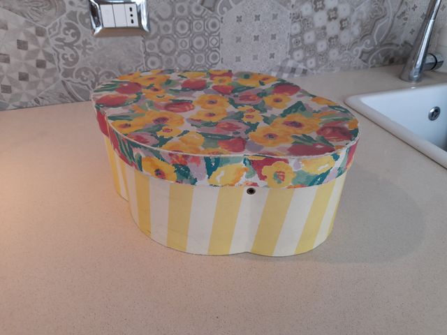 Dettagli del prodottoDeliziosa scatola a forma di cuore con una fantasia floreale vivace sul coperchio e strisce gialle sul corpo.