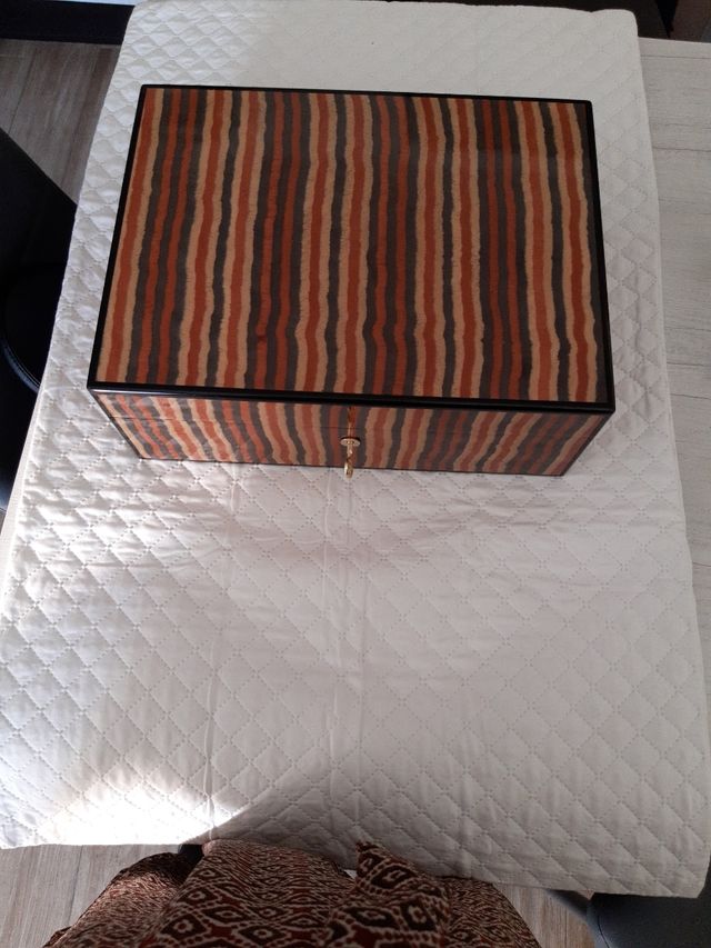 scatola da sigari, come nuova, in puro legno di cedro con umidificatore e legno divisorio. Chiave in acciaio color oro
