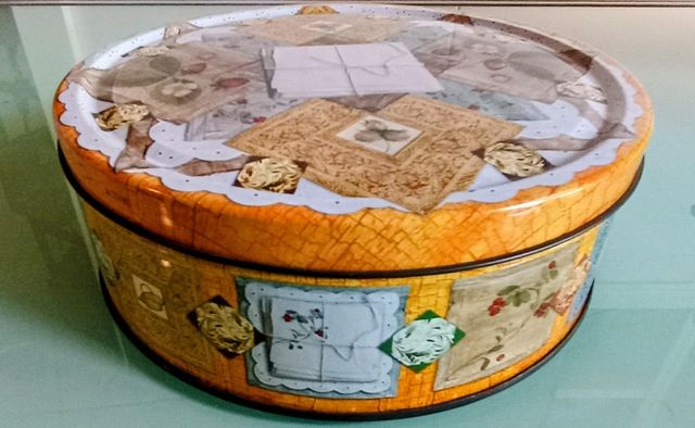 Dettagli del prodottoElegante scatola di latta rotonda con una decorazione a tema vintage.