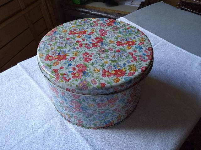 Dettagli del prodottoScatola in latta con coperchio, vintage anni 80, disegno a fiorellini, nuova senza alcun difetto. Misure altezza cm 13, diametro cm 21, circonferenza cm 68 Misure del prodotto