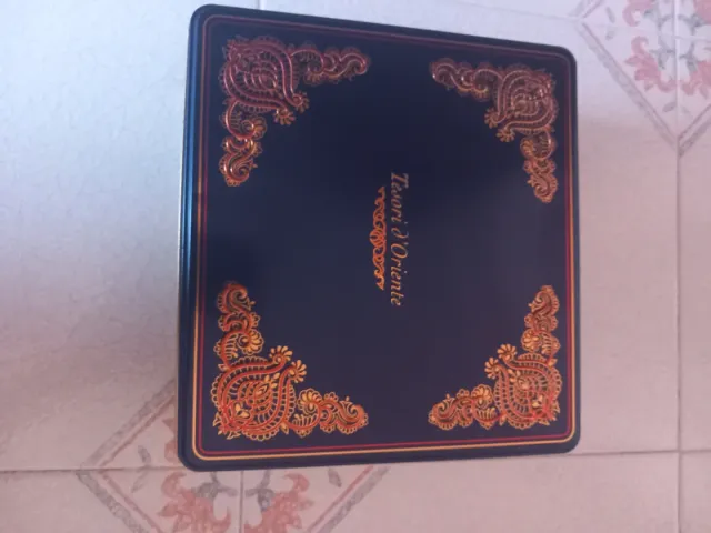 Elegante scatola in latta decorata con motivi floreali e dorati.