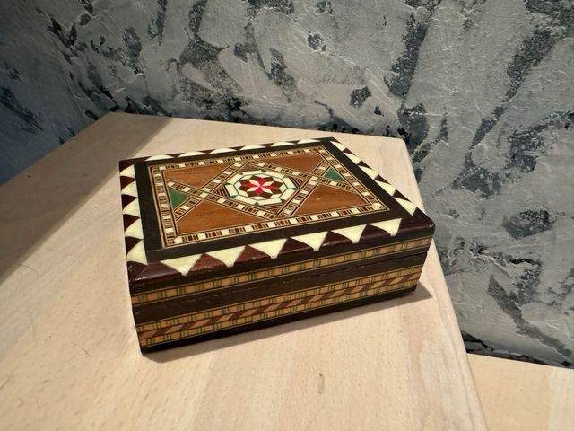 Scatola in legno intarsiato. Laccata