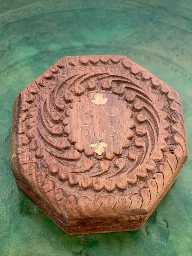 Dettagli del prodotto🕌Scatola indiana in legno intarsiato a forma di esagono.