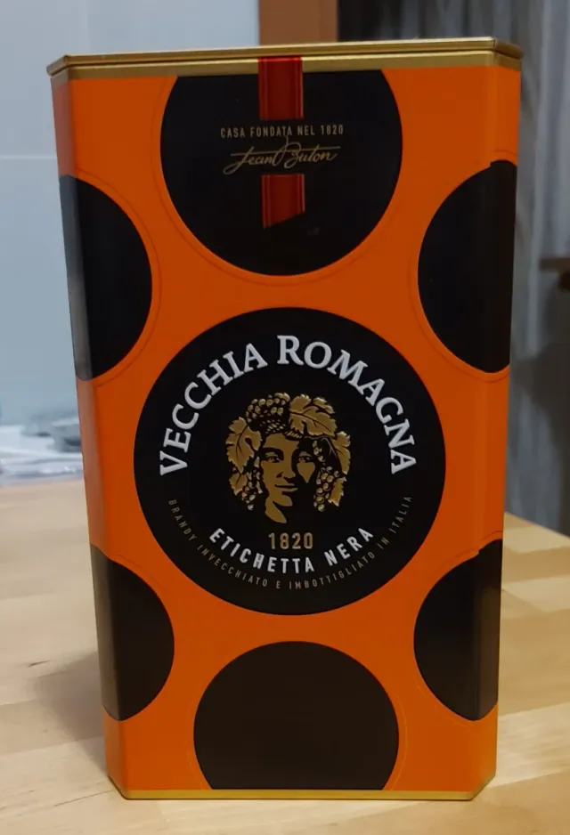 Dettagli del prodottoScatola in latta decorata con il logo di Vecchia Romagna.