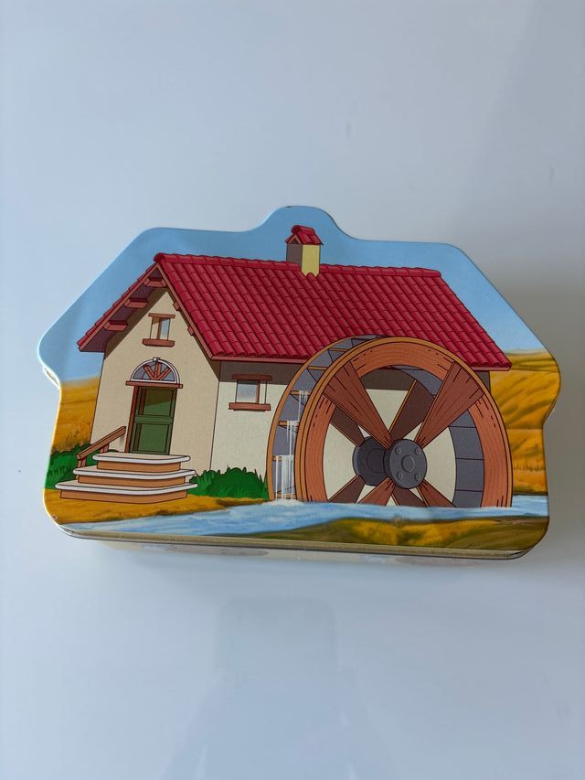 Dettagli del prodottoScatola in metallo Milino Bianco con una stampa colorata di un mulino ad acqua.
