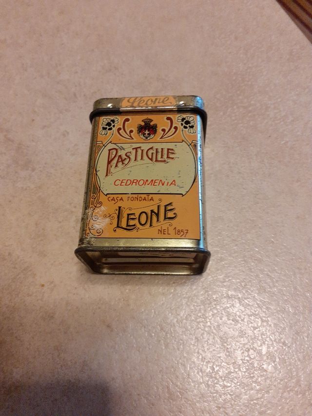 Scatola in metallo da collezione con decorazioni vintage. Cm. 7x5x4 - Marchio: Pastiglie Leone - Decorazione: Cedromenta - Anno di fondazione: 1857