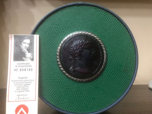 Bellissima scatola impreziosita da altorilievo incorniciato in argento.Mai utilizzata Altezza 6,5 cm,diametro 16cm