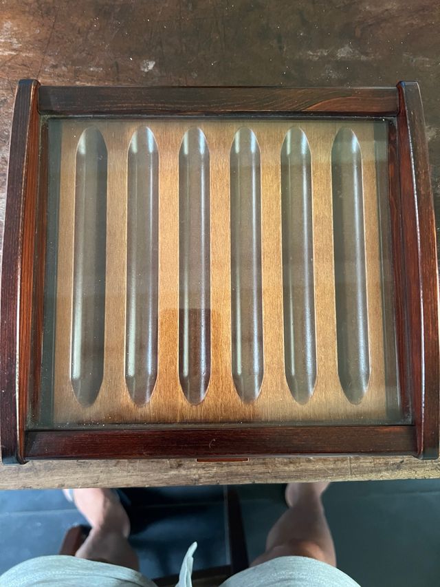 Dettagli del prodottoBellissima scatola porta sigari in legno scuro, con coperchio in vetro. Perfetta per conservare i tuoi sigari preferiti.