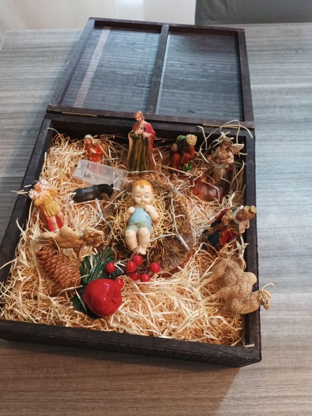 Presepe artigianale,in scatola di legno scuro,con Gesù bambino grande su legno, compreso di luci e decorazione natalizia