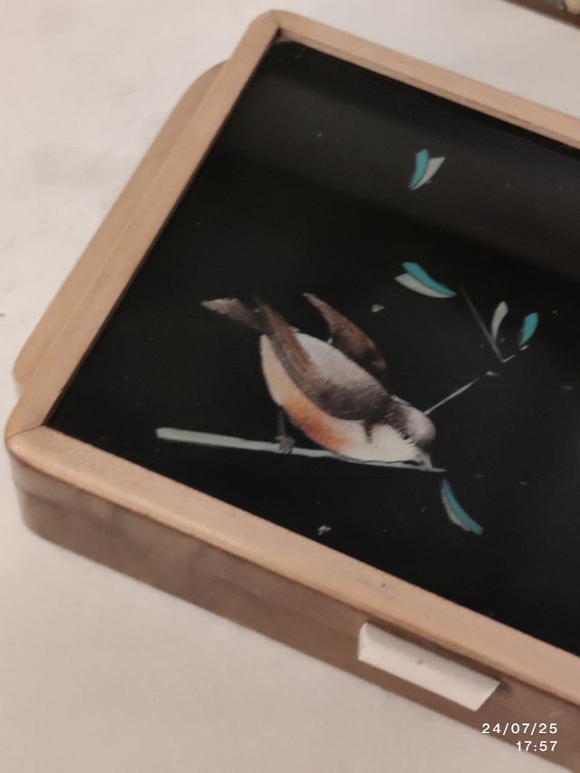 Dettagli del prodottoVendo bella scatola realizzata in legno dolce, con maniglie e tassello per l apertura, in due diverse tonalità. Prima metà del 900 non è un rifacimento moderno o copia. L interno non ha imbottitura, quindi l utilizzo potrebbe essere stato di carta da lettera o per sigari o sigarette. Riporta nella parte anteriore un bellissimo decoro di uccellini su fondo nero ( non è legno sembra materiale plastico a copertura) Ottime condizioni nessun danno, usata pochissimo riporta ancora nella parte sottostante il prezzo di acquisizione di 10 anni fa..