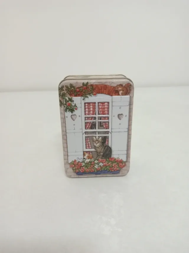 Dettagli del prodottoScatolina in latta decorata con un disegno di gatti e una finestra.