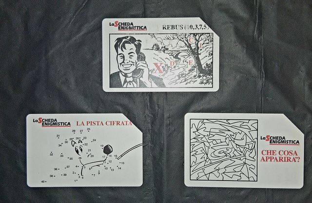 Lotto di schede telefoniche La Scheda Enigmistica. - Scheda Rebus (10,3,7,5). - Scheda La Pista Cifrata. - Scheda Che Cosa Apparirà?.