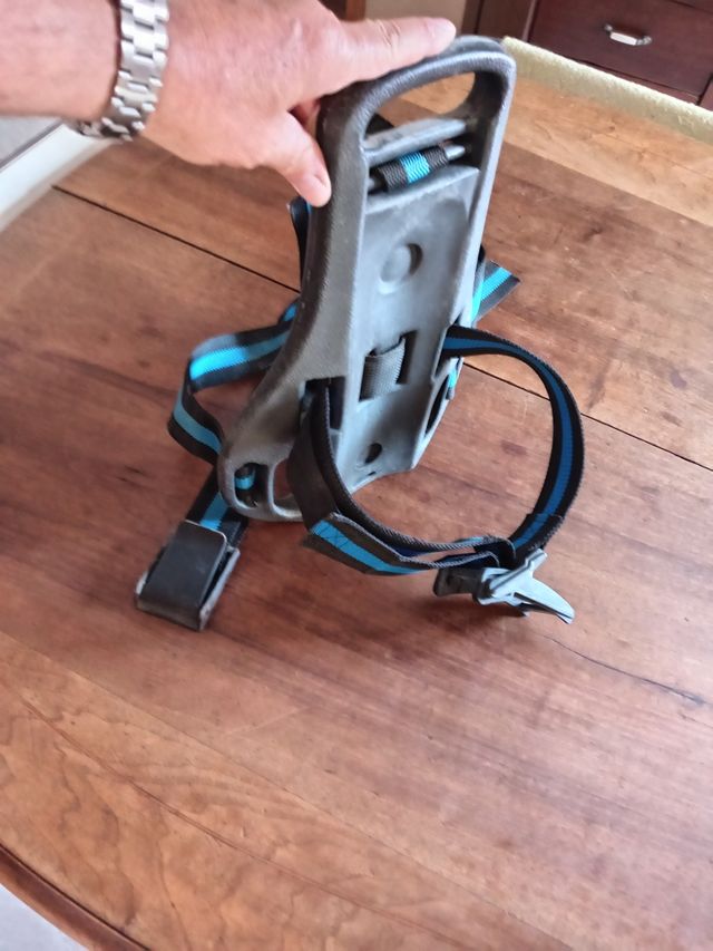 Schienale per fissaggio monobombola 18L da immersione, con cinghie regolabili. - Struttura in plastica resistente. - Cinghie blu e nere. - Maniglia per il trasporto.
