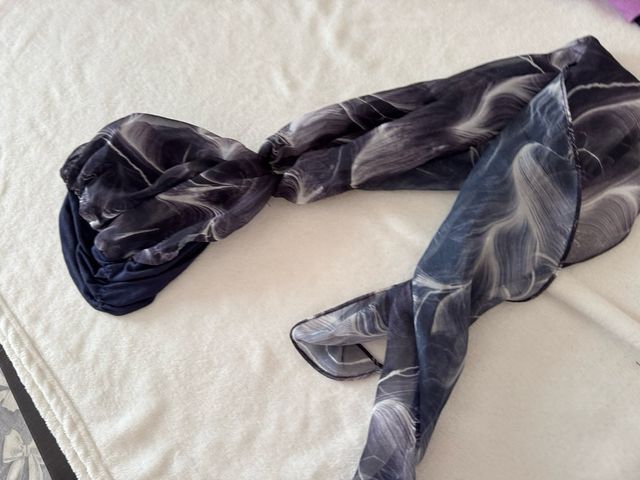Sciarpa leggera con una fantasia astratta e floreale sui toni del blu e del bianco. - Tessuto trasparente e impalpabile. - Bordi rifiniti.