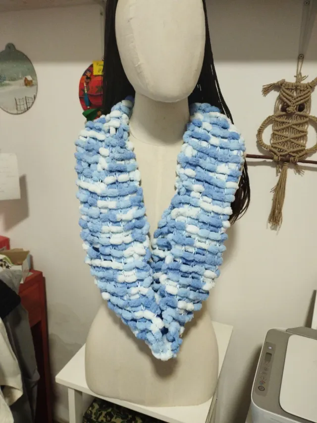 Sciarpa infinity in filato morbido, con un piacevole effetto a pompon. * Filato: Ciniglia - Colori: azzurro e bianco. - Texture soffice e voluminosa.
