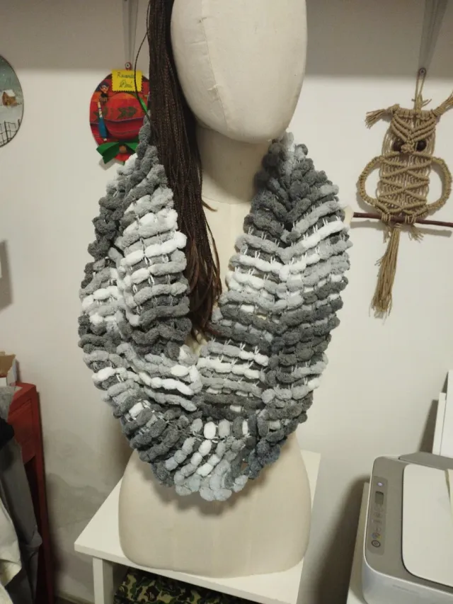 Dettagli del prodottoSciarpa infinity con un motivo a righe sfumate tra il grigio e il bianco. Il materiale è morbido e leggero.