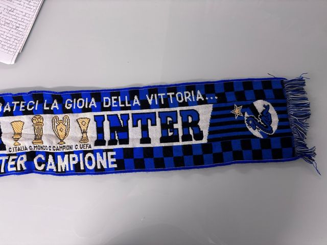Dettagli del prodottoSciarpa celebrativa dell'Inter, con scritte e simboli legati alle vittorie.
