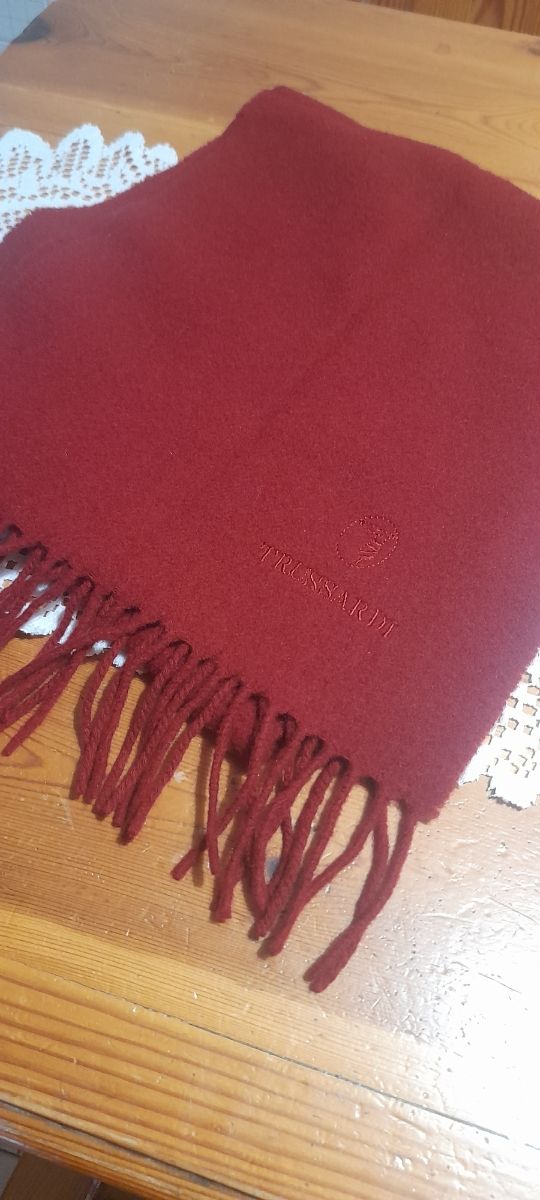 sciarpa uomo Trussardi pura lana, colore bordeau cm. 140 x 30, con frange, logo sul davanti ottima