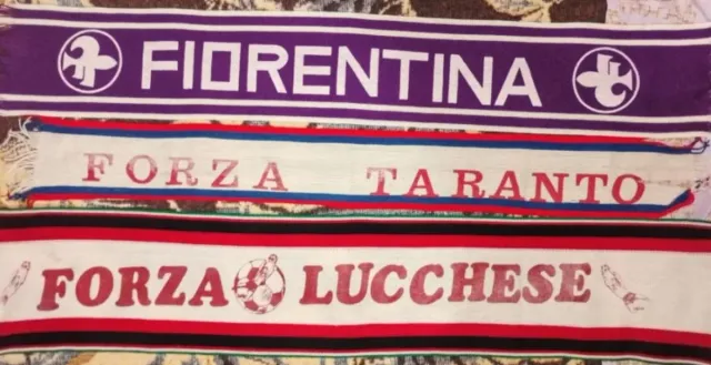 Tre sciarpe da calcio vintage degli anni '80. - Sciarpa Forza Lucchese con logo e disegno. - Sciarpa Forza Taranto con strisce. - Sciarpa Fiorentina con giglio.