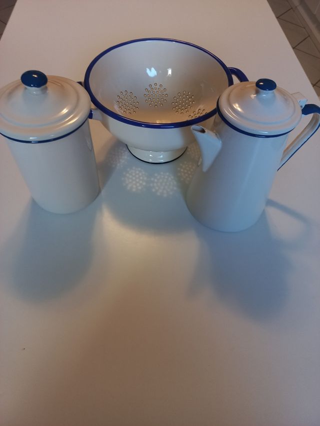 set 3 pezzi cucina country scolapasta caraffa barattolo smaltati bianco/blu nuovi come da foto. vedi sul mio profilo altri articoli simili.