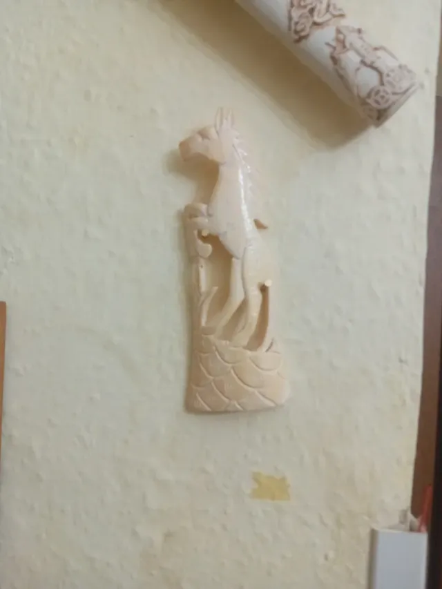 Scultura di cavallo finemente intagliata in avorina. 15 cm - Design dettagliato del cavallo in posizione dinamica. - Base intagliata con motivi a squame.