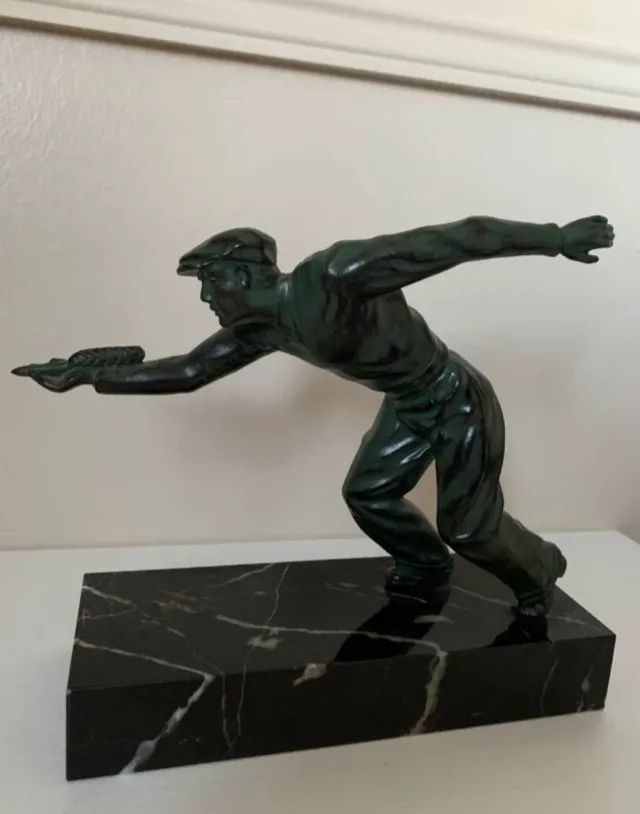 Dettagli del prodottoElegante scultura in stile Art Déco raffigurante un uomo con cappello. La base è in marmo nero.